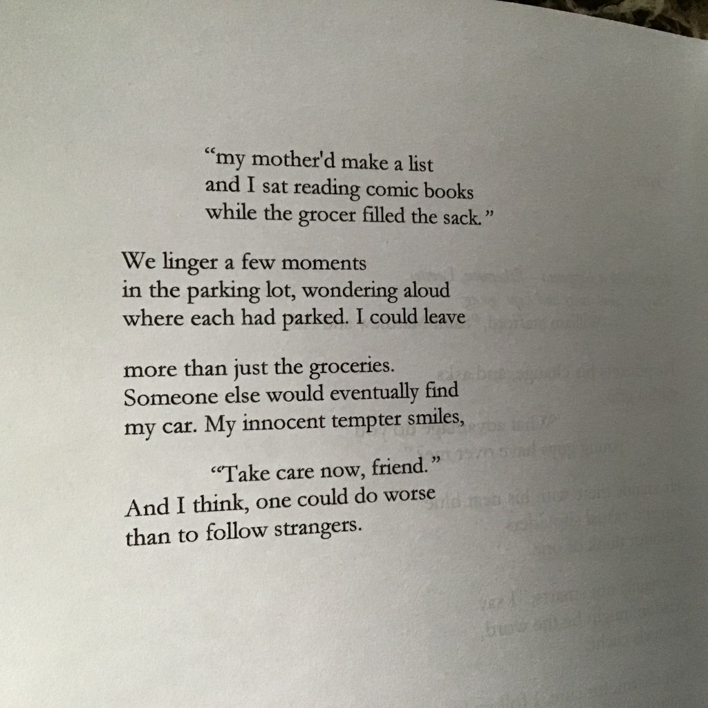 This poem has been through multiple incarnations, and appeared in a just slightly different form, featured with Brian Fanelli and Jason Allen in Contemporary American Voices back in 2013. This version is a bit shorter. I want to say leaner, so lean that it begs to be read slowly. I suppose that’s not a bad thing. It’s such a miniature scene, a fleeting moment at a grocery store, one in which the imagination entertains a seemingly random, stray thought.