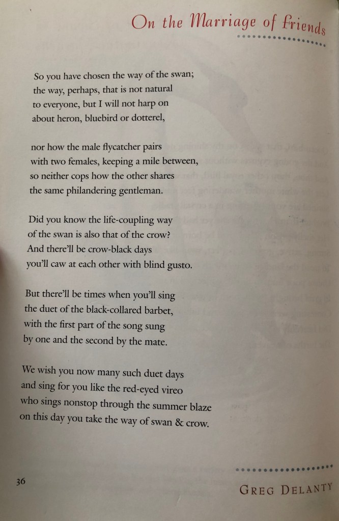 Two years ago today, I had the incredible honor of officiating the wedding of two of the most wonderful people. There is so much I want to say, but for once, words fail me. Luckily, there is the poem. I found this piece by Greg Delanty in the anthology Bright Wings, and it just seemed the perfect piece for this bird-loving poet to read at their ceremony. I will be forever grateful to these two dear friends, for so many reasons, but especially for the chance to be part of their wedding day.