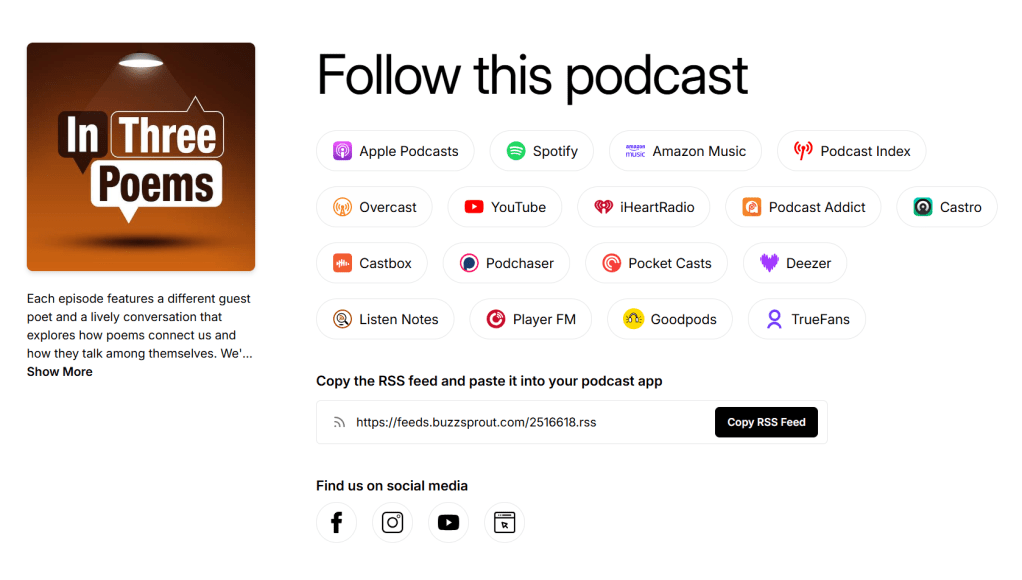 If you’re not sure where to find us, go to inthreepoems.com and click on that big follow button. It will instantly show you a page like the image below. I’ll make it even easier. Just click the image and it’ll take you to the page where you can find us at any of those places.
